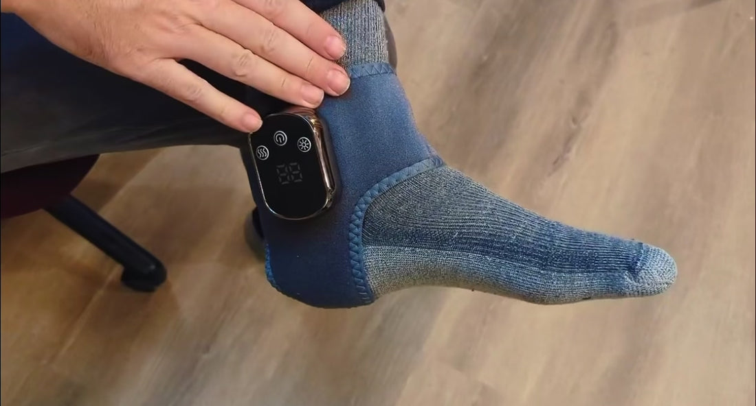 Die Öffnung über die Ferse führen, sodass die Bandage eng am Knöchel anliegt und das Display außen sitzt.